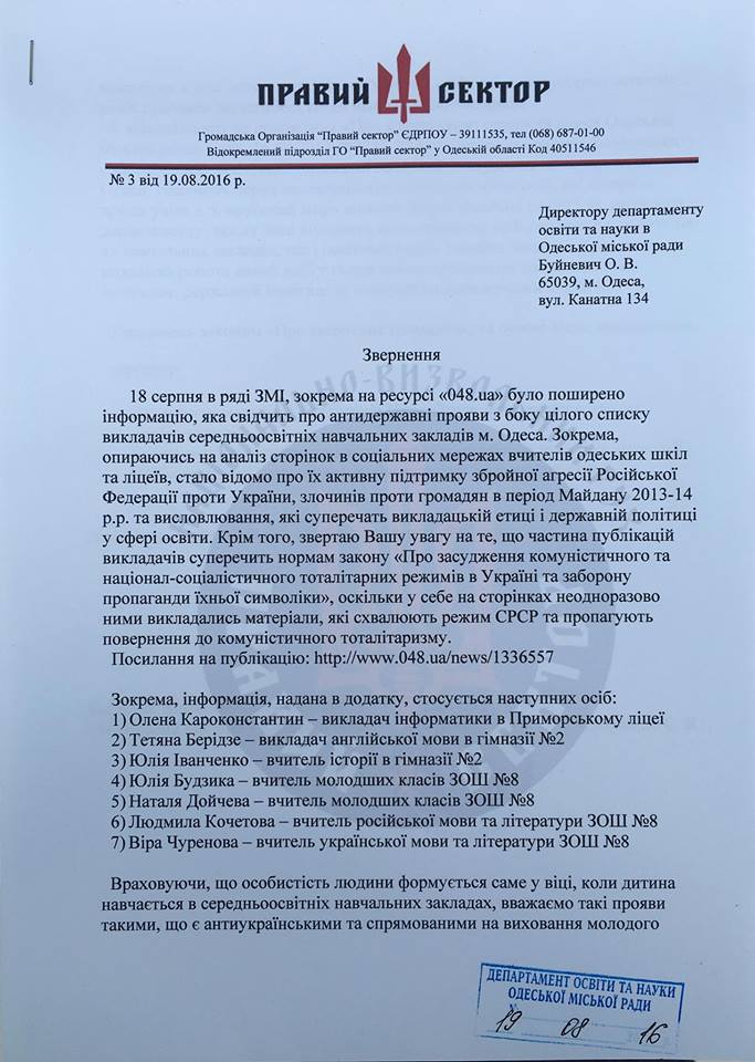 Лидер одесских «правосеков» подчеркнул, что эти учителя «выкладывают публикации, которые одобряют режим СССР и пропагандируют возвращение к коммунистическому тоталитаризму». В письме он назвал пофамильно «учителей-сепаратистов», антиукраинские страницы которых «проанализировал» самолично.
