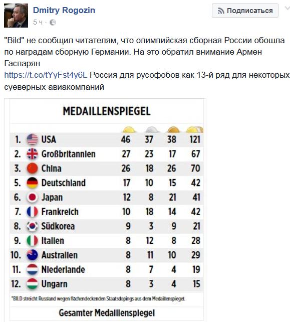 Рогозин поднял на смех немецкую газету, отдавшую Германии 4 место на Олимпиаде (ФОТО)