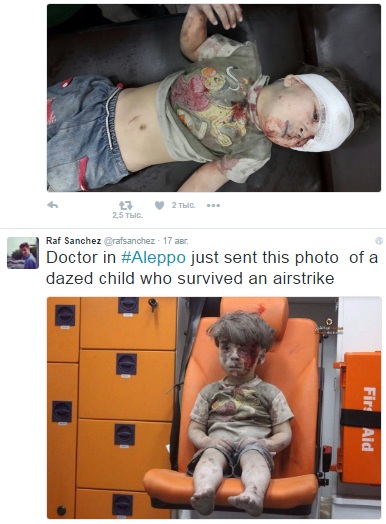 Речь идет о драматичных кадрах спасения из разрушенного здания в сирийском Алеппо 5-летнего мальчика Омрана Дакниша, которого западные журналисты сразу же окрестили «лицом сирийской войны».