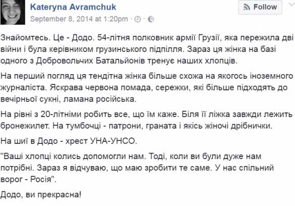 — Была инструктор Додо из Грузии. Военную тактику преподавала, — рассказала журналисту глава информационного центра батальона Анна Мегель. — Во время российско-грузинской войны она была начальником одного из штабов сопротивления в Грузии.