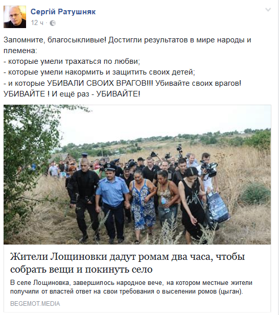 «Убивать цыган» в комментариях к новости о событиях в Лощиновке призвал дважды городской глава Ужгорода и бывший кандидат в президенты Сергей Ратушняк. На своей странице в соцсети, он объяснил украинцам, какие «народы и племена» «достигали результатов».