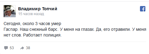 «Сегодня, около 03.00 умер Гаспар. Наш снежный барс. У меня на глазах. Да, его отравили. У меня нет слов. Работает полиция», — сообщил директор зоопарка Владимир Топчий на своей странице в Facebook.