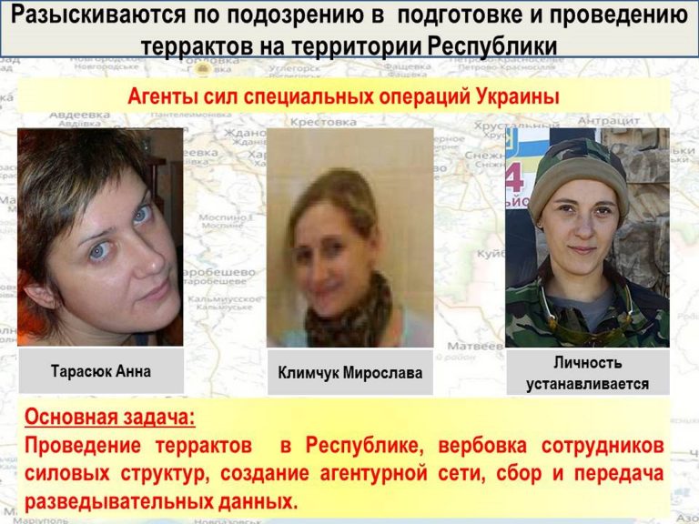 «В августе 2016 года с территории Украины прибыла группа в составе трех женщин, пройдя подготовку под контролем инструкторов сил специальных операций и главного управления разведки, — об этом сегодня на брифинге в пресс-центре ДАН сообщил заместитель командующего оперативным командованием ДНР Эдуард Басурин. — Основная их задача — проведение терактов на территории Республики, вербовка сотрудников силовых структур, создание агентурной сети, получение и передача разведывательных данных».