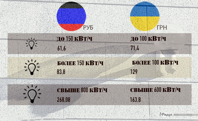 В столице ДНР потребитель платит 62 российские копейки за 1 кВт/ч при условии потребления до 150 кВт/ч в месяц и 84 копейки, если потребляет до 800 кВт/ч. Если же расход оказался выше 800 кВт/ч, то тариф составит 2 рубля 68 копеек за киловатт/час.