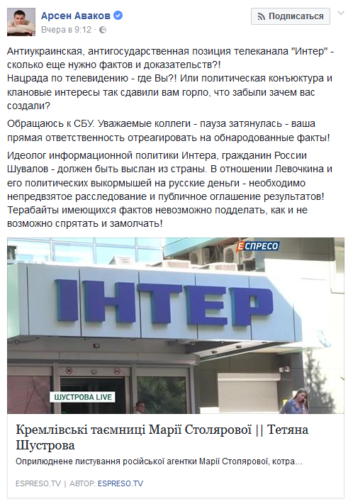 Напомним, ранее Аваков на своей странице в Facebook написал, что «идеолог информационной политики “Интера”» Игорь Шувалов должен быть выслан сотрудниками СБУ с Украины, поскольку Глава МВД отметил, что есть достаточное количество фактов и доказательств антигосударственной позиции телеканала.