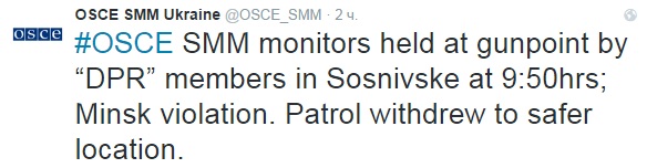 «В 9:50 (2 сентября) в Сосновском представители ДНР угрожали оружием (букв. “взяли на мушку” — прим. РВ) наблюдателям СММ ОБСЕ. Нарушение Минска (Минских договоренностей — прим. РВ). Патруль был выведен в более безопасное место», — говорится в сообщении.
