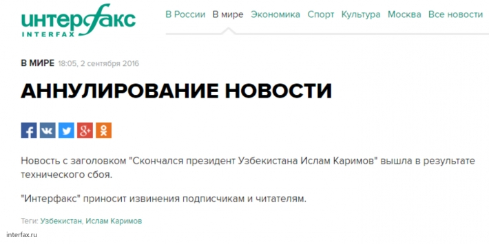 «Новость „Скончался президент Узбекистана Ислам Каримов“ вышла в результате технического сбоя. „Интерфакс“ приносит извинения читателям», — гласит сообщение на официальной станице СМИ в Twitter.