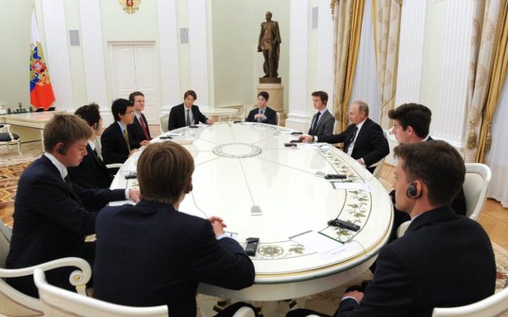 На фото итонские студенты — некоторые в форменных галстуках колледжа (темно-синий галстук с косыми серо-голубыми полосами, на молодом человеке на фото справа – прим.ред.) — за овальным столом с президентом России.
