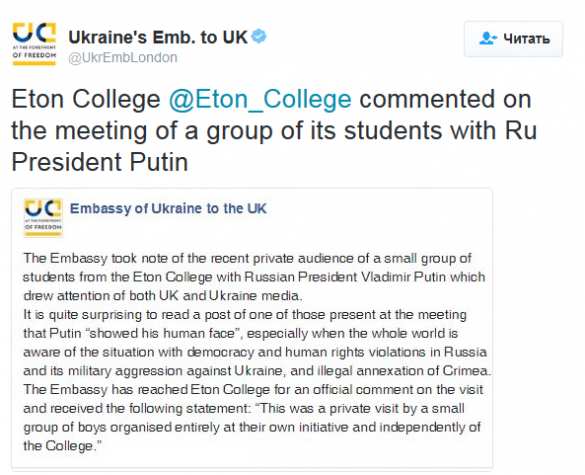 А вот кто прокомментировал, так это посольство Украины в Лондоне, которое уже успело заявить, что «раздражено и удивлено записью в соцсети студента, встретившегося с Путиным».