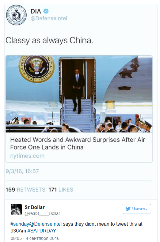 В субботу, 3 сентября, на официальной странице ведомства в соцсети появился твит, комментирующий сообщение New York Times о «холодном приеме», оказанном Бараку Обаме в Китае.