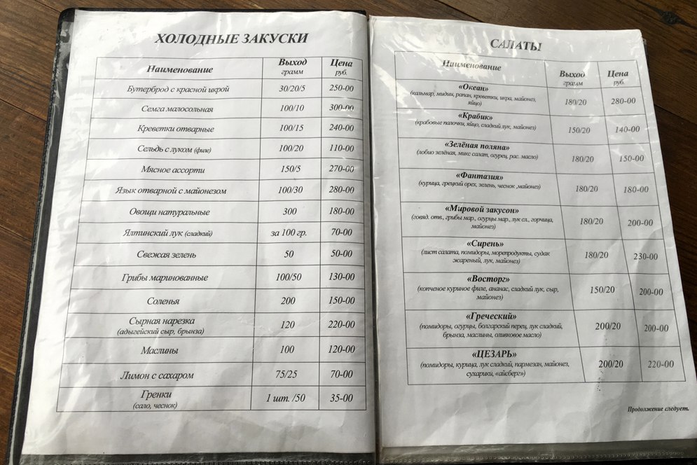А вот цены в кафе «Лагуна» около знаменитой ялтинской Колоннады. Люблю там есть, всегда очень вкусно и красиво подают. Ценник не самый низкий, но и не московский.