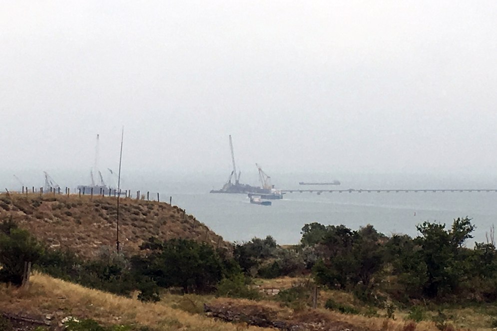 Тот самый мост. Фарватер, слева — рабочий мост-3, справа — рабочий мост-2 и остров Тузла. Вдалеке еле-еле виднеется Краснодарский край.