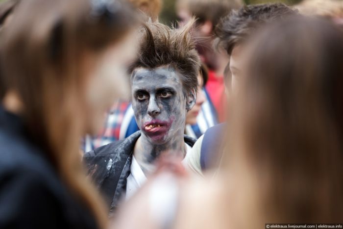 Толпа "ходячих мертвецов", в которых преобразились участники парада, прошла от ботанического сада до Майдана и Контрактовой площади. По пути своего следования любители косплея пугали прохожих и фотографировались в своих ужасающих костюмах.