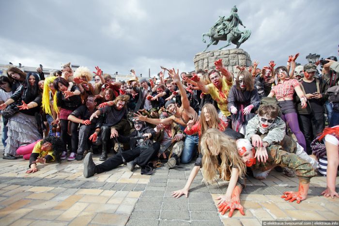 Слово "косплей" в переводе означает "костюмированная игра", это один из видов молодежной субкультуры, пришедший из Японии. Правда, там суть этой субкультуры состоит в том, чтобы предельно точно повторить образ выбранного персонажа из книг, фильмов, мультиков и т. д. А киевская молодежь почему-то очень любит ходячих мертвецов - зомби…