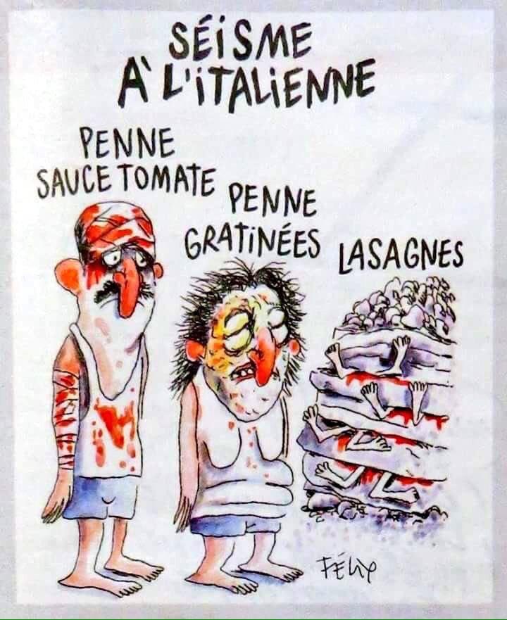 Напомним, на карикатуре, опубликованной журналом Charlie Hebdo под заголовком «Землетрясение по-итальянски», изображены двое мужчин: один из них, с перевязанной окровавленной головой, подписан как «пенне в томатном соусе», второй, с царапинами и запёкшейся кровью, — «запечённая паста».