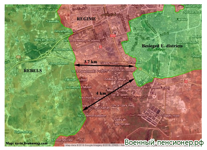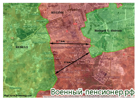 На вечер 8 октября боевиков в Алеппо от своих коллег, которые пытались их спасти отделяет порядка 4 километров по прямой. Но пройти их они не смогли и уже вряд ли смогут.