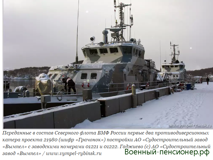 Сданные 23 ноября 2016 года эти два катера стали первыми единицами проекта 21980 постройки АО «ССЗ «Вымпел», и в целом 11-м и 12-м катерами типа «Грачонок» в составе ВМФ России, и первыми катерами этого проекта на Северном флоте. Ранее с 2010 по 2014 годы ВМФ России получил десять противодиверсионных катеров проекта 21980 (семь были построены на АО «Зеленодольский завод имени А.М. Горького» в Зеленодольске и три - на ОАО "Восточная верфь" во Владивостоке). Из этих катеров пять находятся в составе Черноморского флота, три - Тихоокеанского флота, и по одному - в составе Балтийского флота и Каспийской флотилии. Законтрактовано строительство еще 12 катеров типа «Грачонок» - четырех на АО «Судостроительный завод «Вымпел» в Рыбинске, трех - на Зеленодольском заводе, и трех - на Восточной верфи.