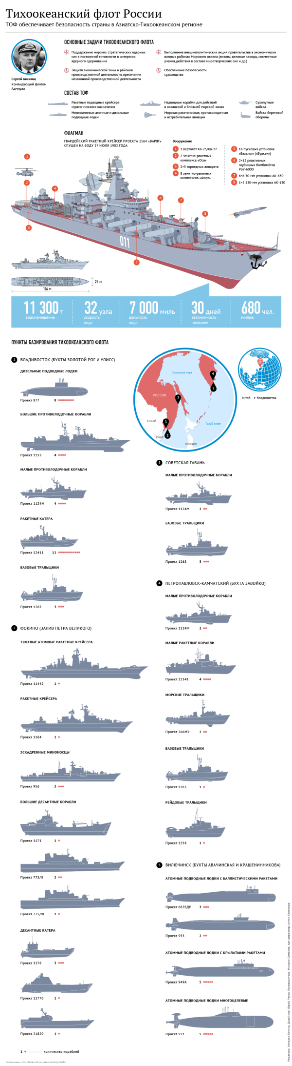 Сегодня Тихоокеанский флот имеет в своем составе атомные и дизельные подводные лодки, которые несут межконтинентальные баллистические ракеты, ударное противолодочное и противокорабельное вооружение, надежно защищая дальневосточные рубежи Российской Федерации.