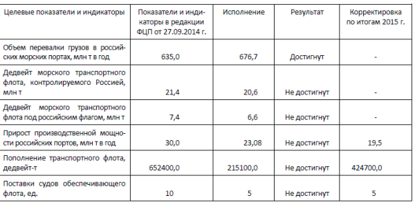 При этом значения 5-ти из 6-ти целевых показателей и индикаторов реализации Подпрограммы в 2015 году не достигнуты, в том числе: дедвейт морского транспортного флота, контролируемого Россией,с оставил 20,6 млн тонн при установленном значении 21,4 млн тонн- дедвейт морского транспортного флота под российским флагом составил 6,6 млн тонн при установленном значении 7,4 млн тонн- прирост производственной мощности российских портов составил23,08 млн тонн в год при установленном значении 30,0 млн тонн в год- пополнение транспортного флота составило 215100 дедвейт-тонн при установленном значении 652400 дедвейт-тонн- поставки судов обеспечивающего флота составили 5 единиц при установленном значении 10 единиц.