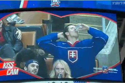 Видео: Brady Trettenero / Twitter Болельщик сборной Словакии, попавший в объектив Kiss Cam во время матча молодежного чемпионата мира по хоккею, вместо своей спутницы поцеловал стакан пива, после чего залпом выпил его. Видео эпизода размещено в Twitter пользователя Brady Trettenero....