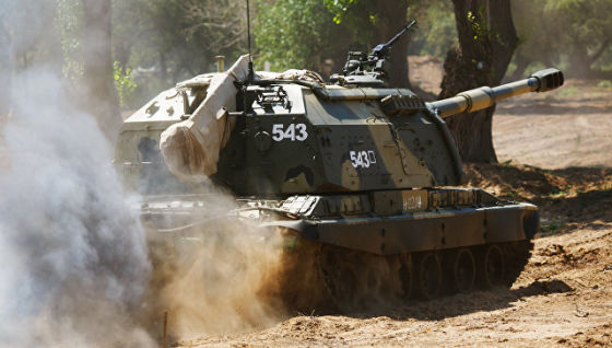 Самоходная артиллерийская установка 2С19 МСТА-С во время прохождения полосы препятствий на конкурсе по полевой выучке среди инженерно-саперных подразделений "Безопасный маршрут" на территории 187-го Псковского межвидового регионального учебного центра в городе Волжский....